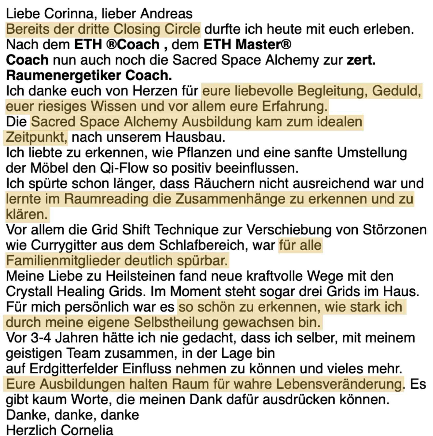 Während der Ausbildung transformierst du dein eigenes Zuhause Schritt für Schritt zu einem wahren Kraftort. Alle Erkenntnisse und Veränderungen hältst du in einem umfassenden Bericht fest. Diesen reichst du bei uns ein. Corinna & Andreas geben dir dazu ein persönliches, individuelles Feedback.
