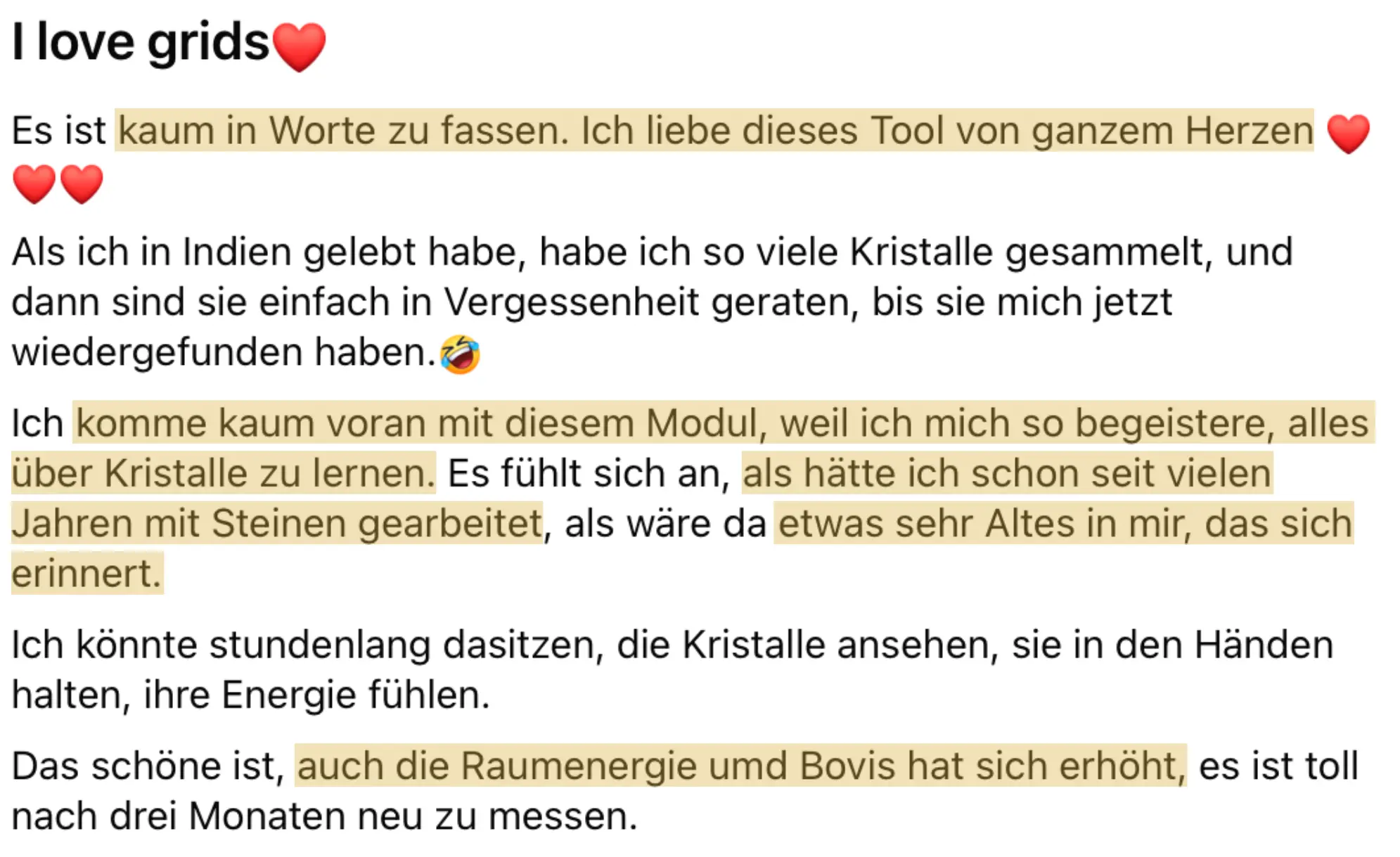 Vor allem die Grid Shift Technique zur Verschiebung von Störzonen wie Currygitter aus dem Schlafbereich war für alle Familienmitglieder deutlich sprürbar. Vor 3-4 Jahren hätte ich nie gedacht, dass ich selber, mit meinem geistigen team zusammen, in der Lage bin auf Erdgitterfelder Einfluss nehmen zu können und vieles mehr.