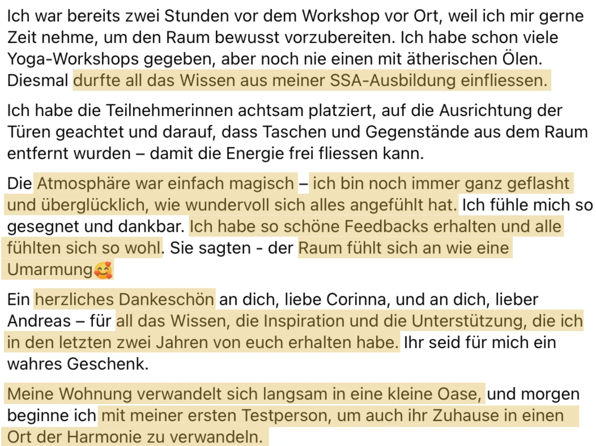 Als Interior Designerin habe ich zuvor vor allem im Sichtbaren gearbeitet. Erst durch die SSA-Ausbildung wurde mir aber bewusst, wie stark unsichtbare Energien wirken und mich selbst auch nach mehrfachem Räuchern immer noch spürbar beeinflusst haben.